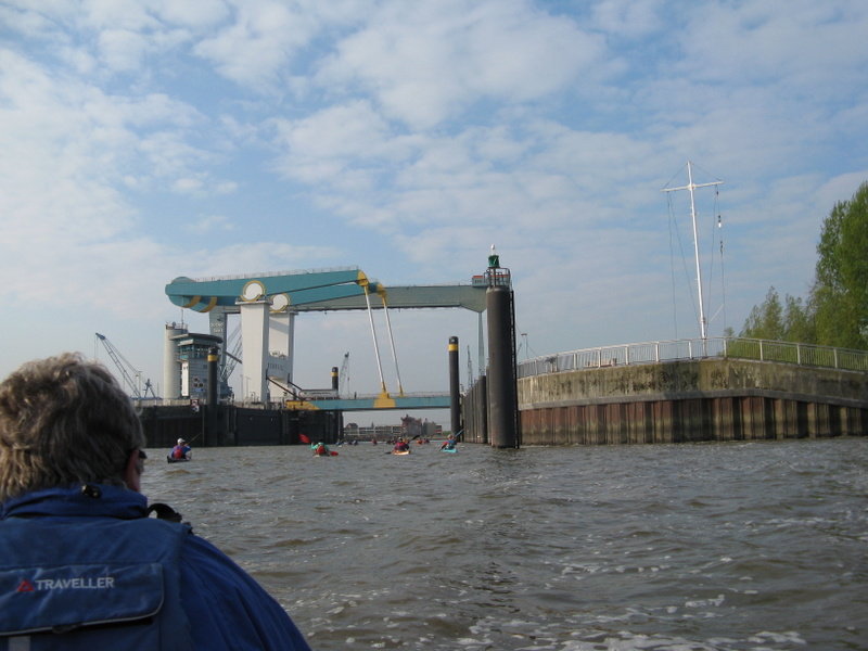Mit Hilfe der Flut geht das recht flott und nach 1,5 Stunden landen wir in Buxtehude bei einem Wassersportverein an. Dort haben wir nun Zeit zum Vespern usw. bis wieder die Ebbe einsetzt. Wieder einmal sehen wir wie man am schnellsten vorankommt. Die Paddler, die wir schon mehrmals vorne sahen (u.a. auf der Oder) drängen sich doch tatsächlich bei jeder Gelegenheit vor, drücken ihre Boote über andere, Hauptsache, sie haben einen vorderen Platz. Wir fahren dann erst gemütlich, dann aber flotter die Este abwärts, denn plötzlich sind wir hinten allein. Am Sperrwerk angekommen sind die anderen schon fort, obwohl abgesprochen war, dass gemeinsam abgefahren wird. Immerhin können wir noch eine Fahrtenbegleiterin erreichen, die dachte wir seien die ersten der 2. Gruppe. Wir fahren gemeinsam die betonnte Strecke, denn die Elbsände schauen schon verdächtig weit aus dem Wasser. An der Fahrrinne kommen wir dann zur Gruppe und es geht mehr oder weniger geschlossen über das Fahrwasser. Heute sind einige große Schiffe unterwegs, der Anblick ist beeindruckend.