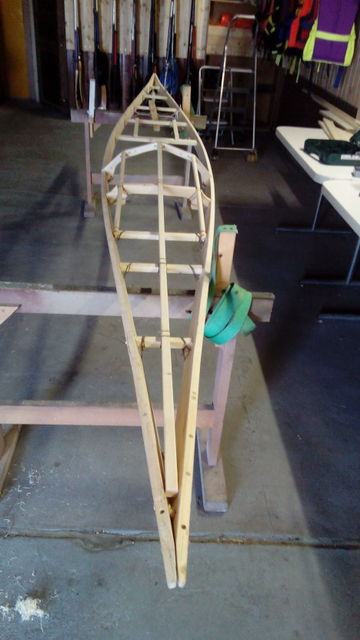 die Gunwales werden an Bug und Heck fixiert, dann wird die Bootsform durch die Querleisten gestaltet