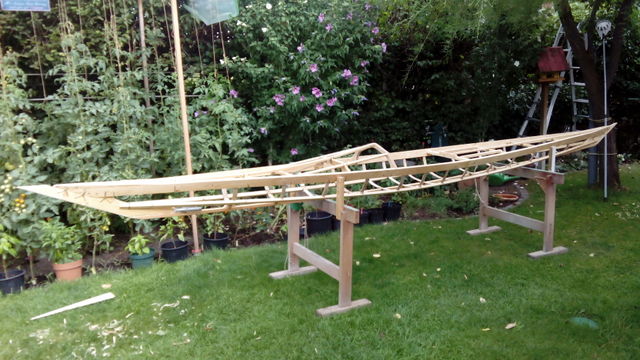 Nun ist die Form des Kajaks so ziemlich festgelegt. Die Höhenmaße können jetzt nur noch durch Veränderung der Steven geändert werden. Inzwischen sind wir aus dem Urlaub zurück und die Wetterlage ist gut, daher wird das Gerüst in unseren Garten verlagert. Nun kommen viele Kleinarbeiten, für die ich nicht immer ins Bootshaus fahren möchte.